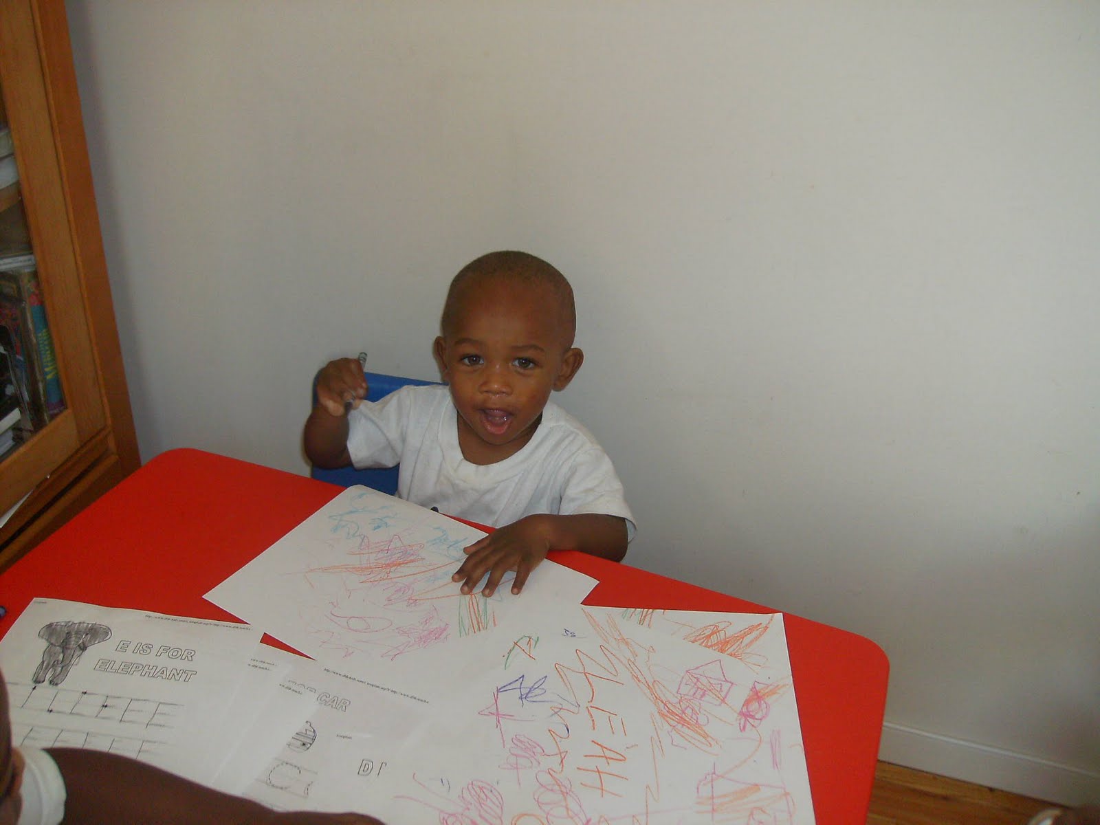 writing implement he looks at us, then the wall, then takes off running. We chase him around the living room into Erick’s room to confiscate said item.
