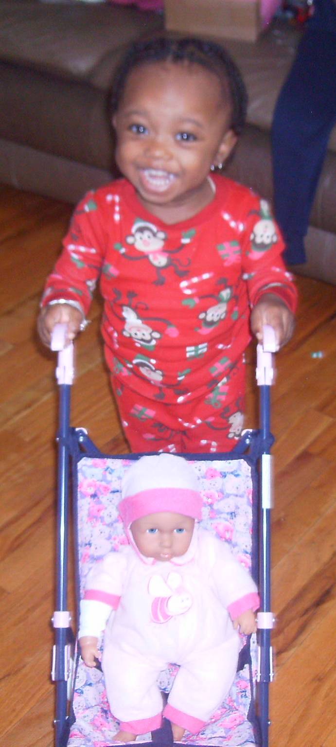 This Christmas Miss Leah received her first baby doll and carriage. Her dad stared at her in awe because he couldn’t believe that his 20 month old daughter knew what to do with a baby doll. Is it just maternal instinct he kept asking me? Of course it is I told him, mommy’s just know how to handle their babies! Even at 20 months old. Leah’s doll says, mama, papa, bye bye, it snores and it cries. The boys are typical boys! Erick wants to play football with the doll and Myles wants to sit in the carriage.