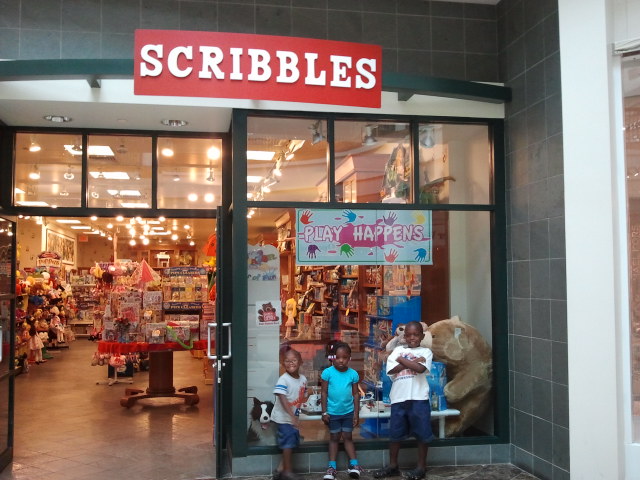 This Twin Tuesday’s post is dedicated to the twins’ favorite “play mall” SCRIBBLES. SCRIBBLES is a fantastic interactive and educational store in the Menlo Park Mall that features personalized gifts for children & educational toys. We visit SCRIBBLES at least once a week and hang out there for about 2-3 hours (yes hours in one store). Typically we don’t purchase a thing (unless it’s a work book on sale) but the twins play HARD with everything that is out on display.